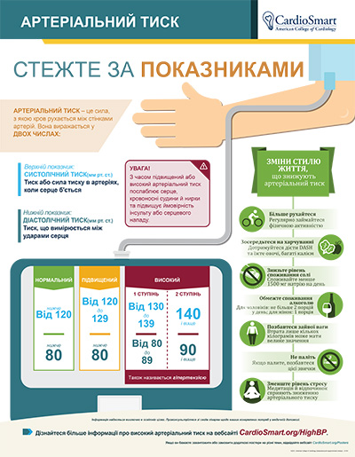 Blood pressure is the force of your blood moving against the walls of your arteries. For more information, visit CardioSmart.org/HighBP.Download the file to print the infographic in Ukrainian.