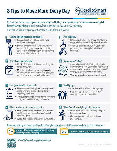No matter how much you move – a lot, a little, or somewhere in between – every bit benefits your heart. Make moving more part of your daily routine. Use these simple tips to get started – and keep moving.